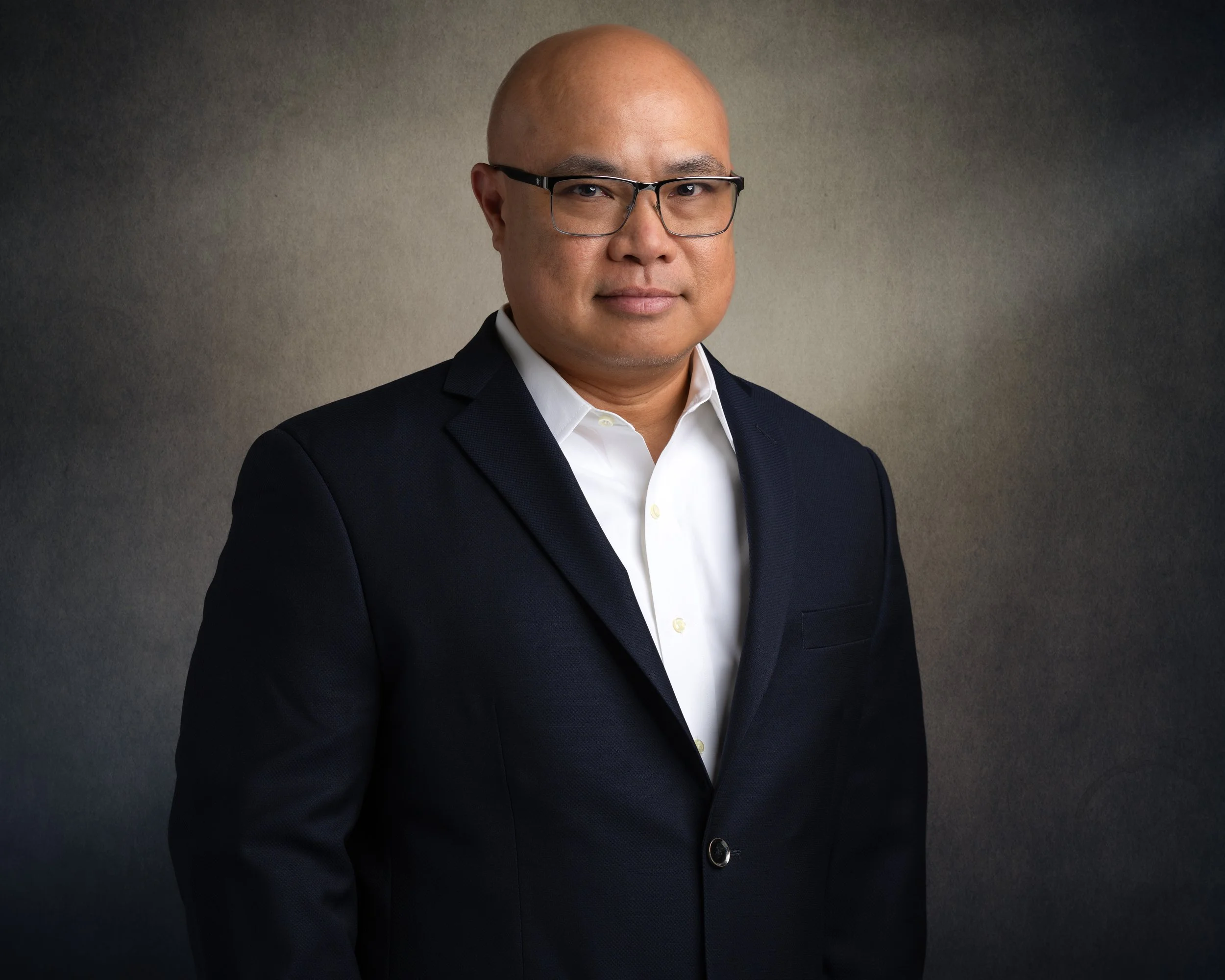 Bald man in a dark blue suit with a white shirt against a dark background.