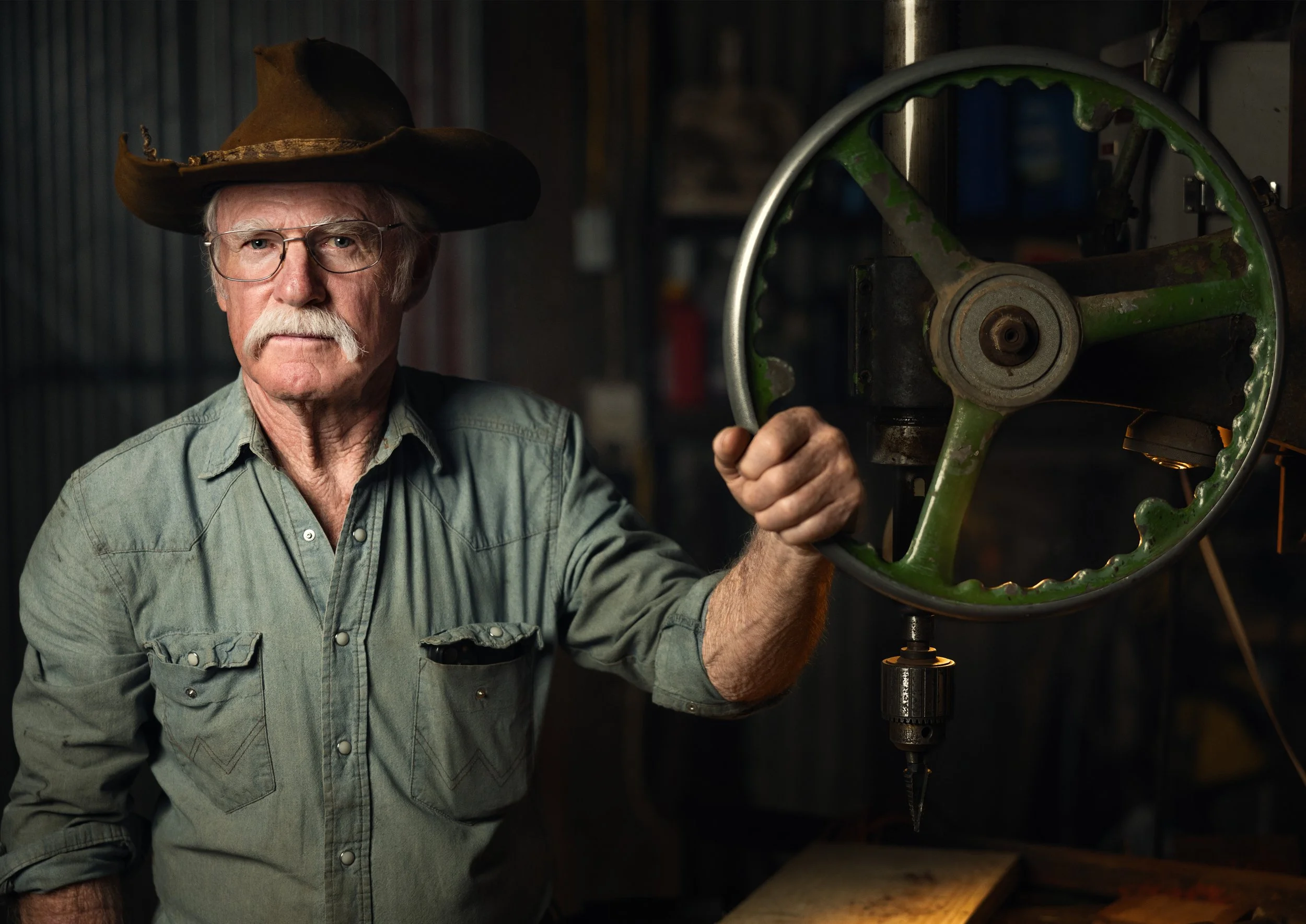 Older man in a cowboy hat and denim shirt standing next to industrial equipment in a workshop.